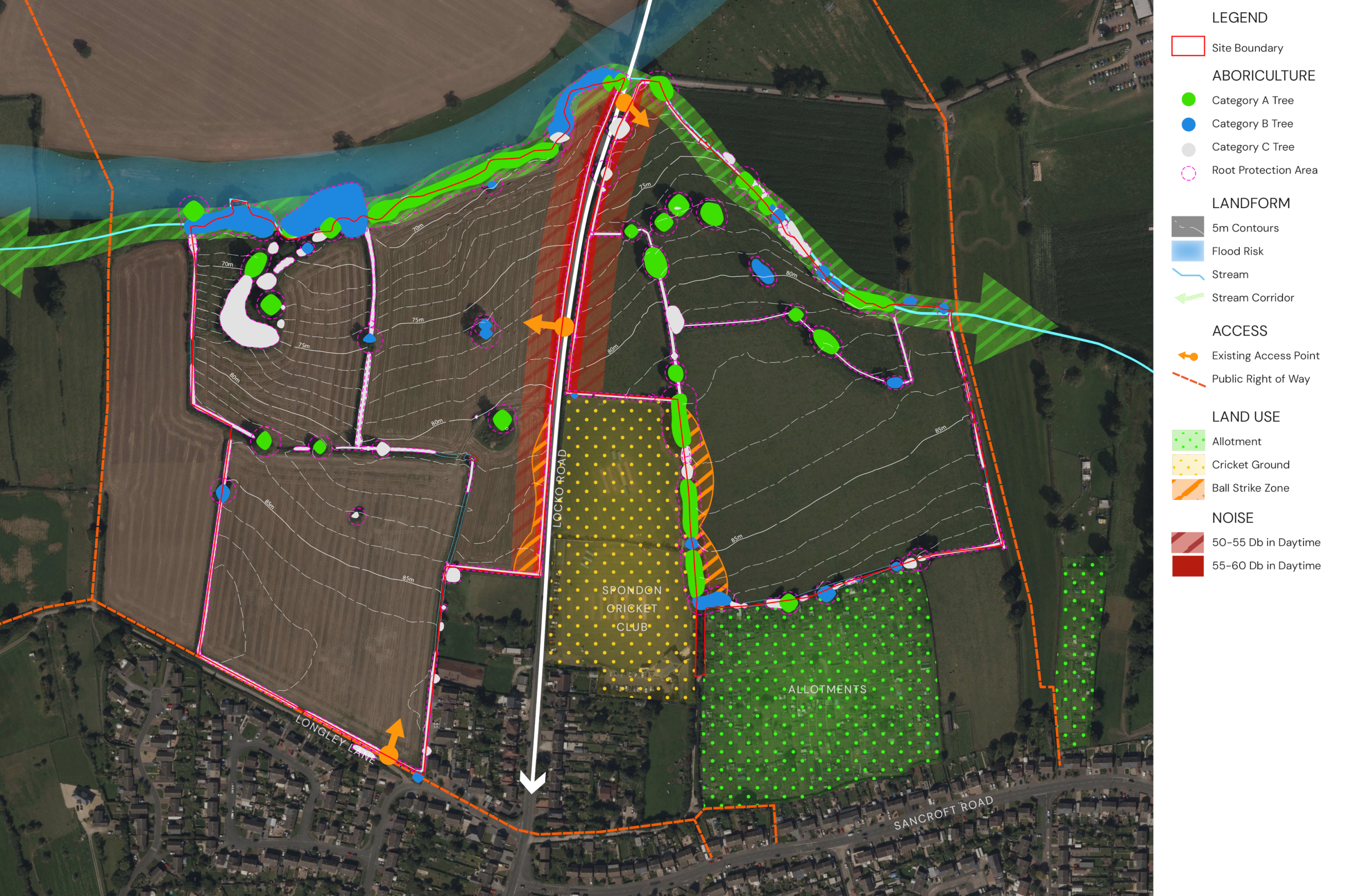 In preparing the concept layout for the site, the technical team appointed by Bloor Homes first of all considered the landscape, drainage features, topography and local context of the site. The following plan shows some of the features and constraints that have informed the emerging outline proposals. Key features include a gentle slope from the south to north, increasing as the northern boundary is approached, existing mature trees and hedgerows, public rights of way to the west and east of the site and neighbouring uses such as Spondon Cricket Club and allotments.
